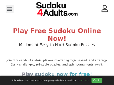 这是一个专为成年人设计的在线数独游戏网站。它提供了简洁、无干扰的界面,用户可以直接在浏览器中游玩,无需下载或注册。网站包含从简单到专家级的多种难度,并提供笔记、错误检查和提示等辅助功能,旨在提供一个纯粹、专注的逻辑思维训练体验。