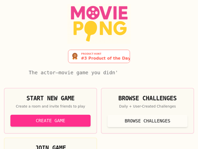 MoviePong是一个互动性强的社交电影猜谜游戏。用户通过一张图片来猜测电影名称,可以与朋友、家人一起玩,创建自定义游戏,或挑战全球社区玩家。该应用结合了电影知识、社交互动和益智游戏乐趣,提供排行榜、数千部电影等功能,并可在iOS和Android设备上下载使用,是电影爱好者和喜欢社交游戏玩家的理想选择。