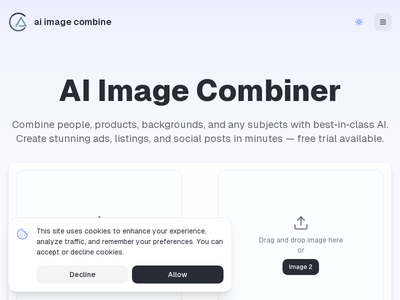 这是一个在线AI工具,专门用于将两张或多张图片智能地、无缝地合并成一张全新的图片。它利用人工智能技术,自动分析和匹配源图片的颜色、光照、色调和主体,从而创造出自然、协调的合成效果,用户无需复杂的P图技巧即可快速生成创意合成图。